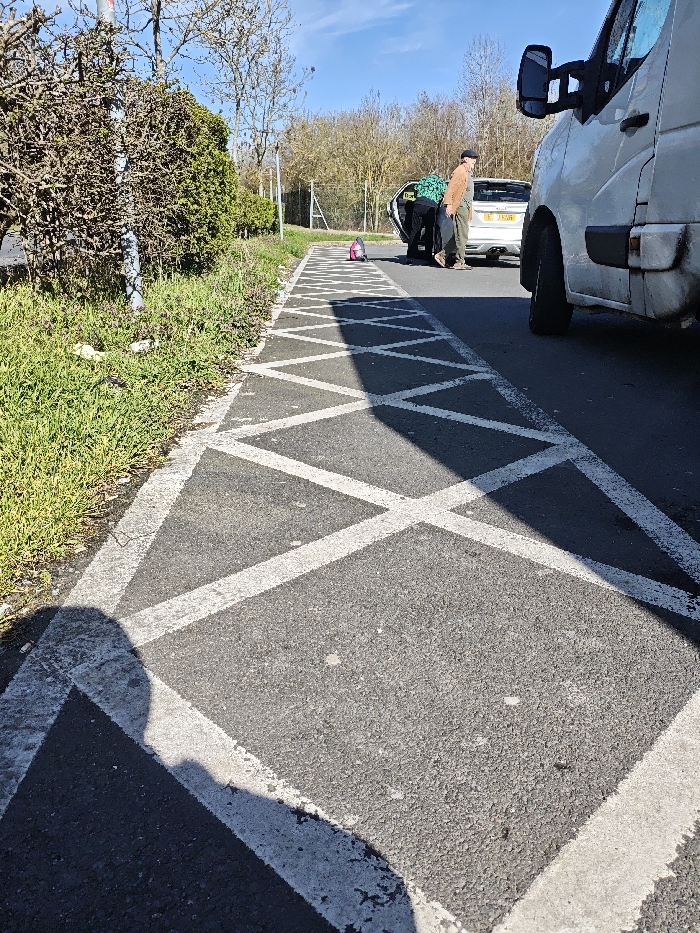 The scene is set in an outdoor area of Uttlesford, United Kingdom, under a clear blue sky on a sunny day. The foreground features an asphalt surface with white diagonal cross-hatch markings, typically designating a no-parking or keep-clear zone. A distinct shadow, originating from the photographer, is cast across the lower-left portion of these markings. To the left, a strip of green grass and low vegetation abuts a dense, trimmed hedge, partially obscuring a light-colored pole or signpost. On the right side of the image, two vehicles are present. A white cargo van, partially visible from its passenger side and facing away from the camera, occupies the immediate right. Its prominent side mirror is angled outwards. Behind the van, a lighter-colored (possibly silver) hatchback car is parked. This vehicle has its rear trunk open and displays a UK registration plate: "LD70 FZV." Two individuals are positioned near the open trunk of the hatchback. One person, wearing a dark top with a green patterned design, is leaning into the vehicle's trunk opening. Adjacent to this individual stands a second person, attired in a brown jacket, light-colored trousers, and a dark cap, observing the activity at the trunk. A small pink or purple bag rests on the asphalt near the hatchback's rear. The background reveals a line of deciduous trees, mostly bare, with a chain-link fence visible between them and the vehicles.