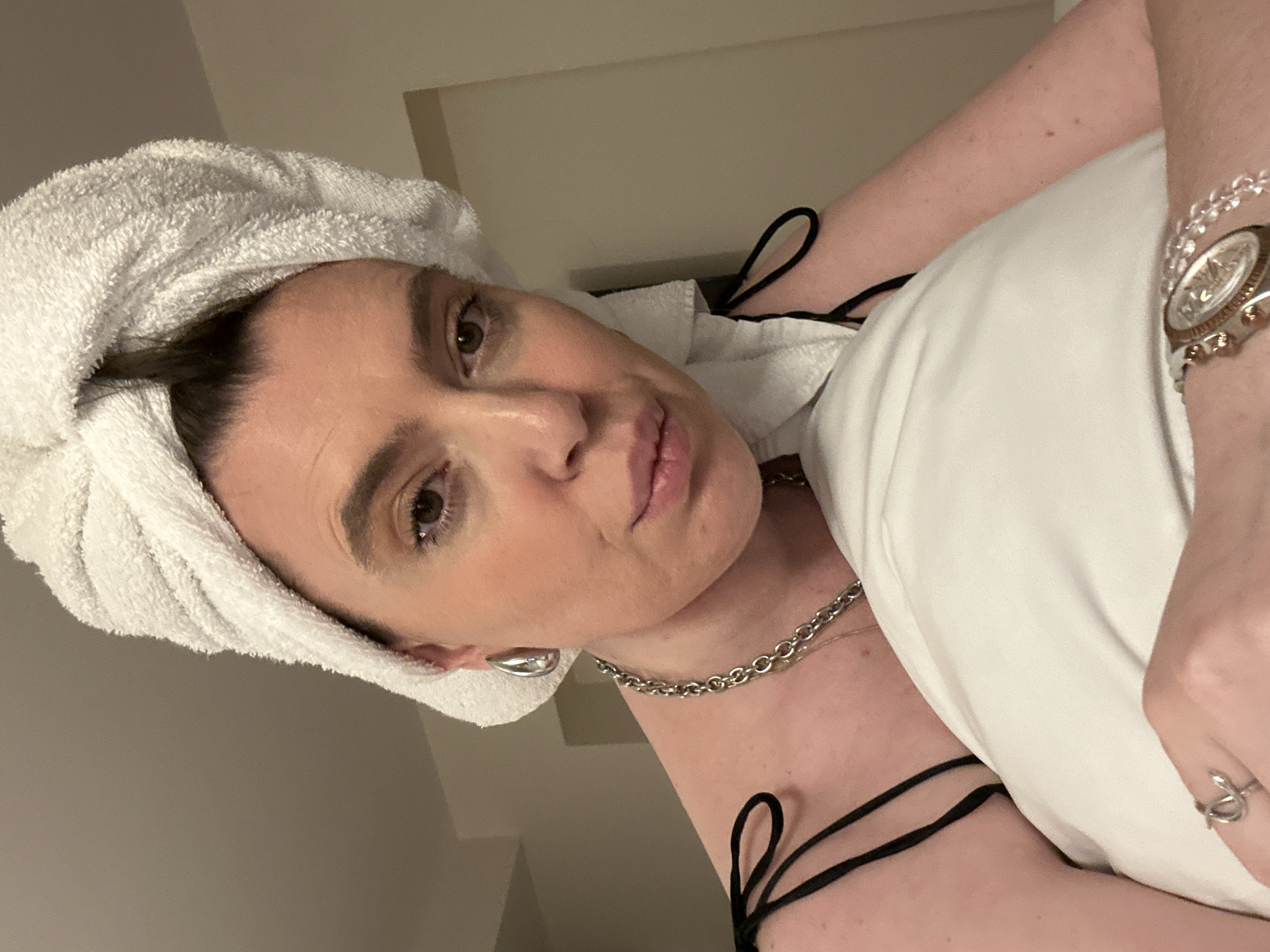 A woman with a towel wrapped around her head poses for a selfie. She is partially reclined against a white surface, possibly a pillow. She is wearing a black top with thin straps, a silver chain necklace, and jewelry on her wrist and hand. The background suggests an indoor setting with neutral-colored walls. The photograph appears to have been taken in low light. The location is not possible to determine from the image.
