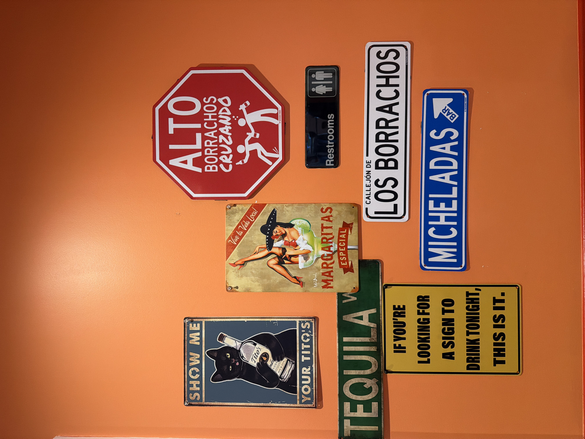 A collection of humorous signs and decorative items is mounted on an orange wall. The signs contain text in both English and Spanish and seem to be bar-themed. The location is unspecified, but the OCR detected text includes "Tito's" and "MAN CAVE". A sign with the phrase, "IF YOU'RE LOOKING FOR A SIGN TO DRINK TONIGHT, THIS IS IT," is also visible. The location in the city of Paramount, United States of America, can not be determined.