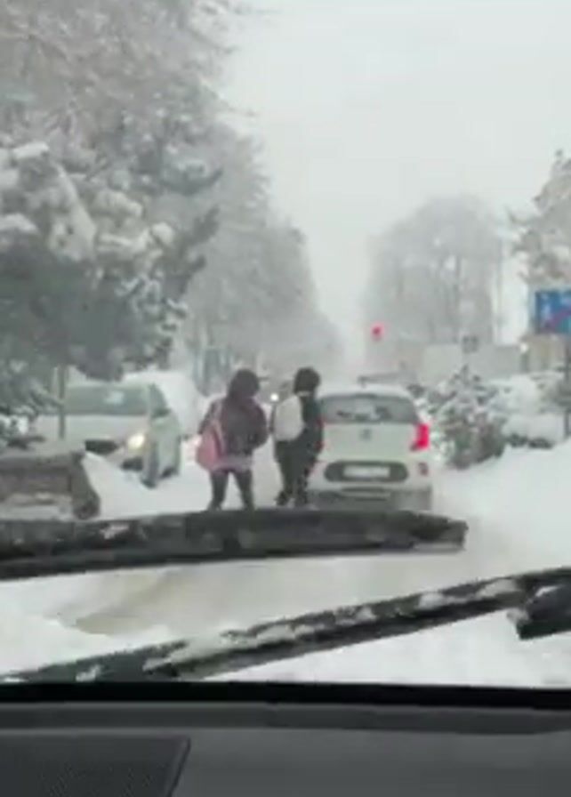 The view from inside a car shows a snowy street. Two people with backpacks walk across a snow-covered crosswalk in front of the car. Cars are parked along the side of the street, also covered in snow. Trees lining the street are laden with snow. The sky is overcast, and snow is falling. The traffic light in the distance is red.