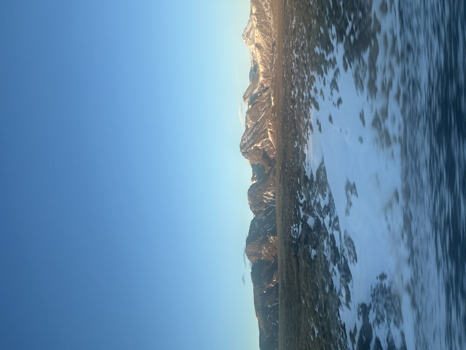 The image displays a vast, open winter landscape located in the vicinity of Laugarvatn, Iceland. The upper two-thirds of the frame are dominated by a clear, bright blue sky with a slight gradient, transitioning to a lighter hue near the horizon. A continuous range of rugged, dark mountains spans the middle ground, featuring exposed rock and significant snow cover on their slopes and peaks. Low-angle sunlight illuminates the rightmost peaks, highlighting their snow-capped surfaces with a warm, golden tone, while the mountains to the left are darker, possibly in shadow. The foreground and midground consist of a broad expanse of terrain covered by dark, low-lying ground vegetation or exposed earth, heavily interspersed with irregular patches of white snow. Horizontal motion blur is evident across the bottom portion of the foreground. No individuals, animals, or man-made structures are visible within the scene.