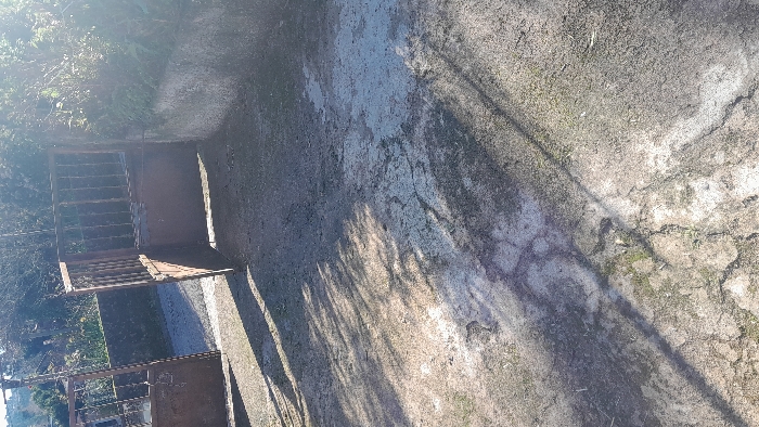 This image presents an exterior scene in Vila Nova de Famalicão, Portugal, depicting a property entrance under strong sunlight. The foreground consists of an uneven, light-colored ground surface, characterized by cracked concrete or compacted earth with patches of moss and sparse vegetation. Multiple elongated shadows, cast from objects outside the frame and the gate itself, extend across this surface from the upper right. In the midground, a two-panel metal gate, visibly rusted and showing signs of wear, is open inwards. The left panel is fully swung open, positioned perpendicularly to the viewer, while the right panel is partially ajar, angled toward the interior of the property. To the right of the gate, a low, weathered concrete or stone wall runs horizontally, partially obscured by dense green foliage. Beyond the open gate, a sunlit path or driveway is visible, gently inclining upwards, with further natural vegetation in the distant background. No individuals or specific actions are observed within the frame. The scene is brightly illuminated, indicating clear weather conditions.