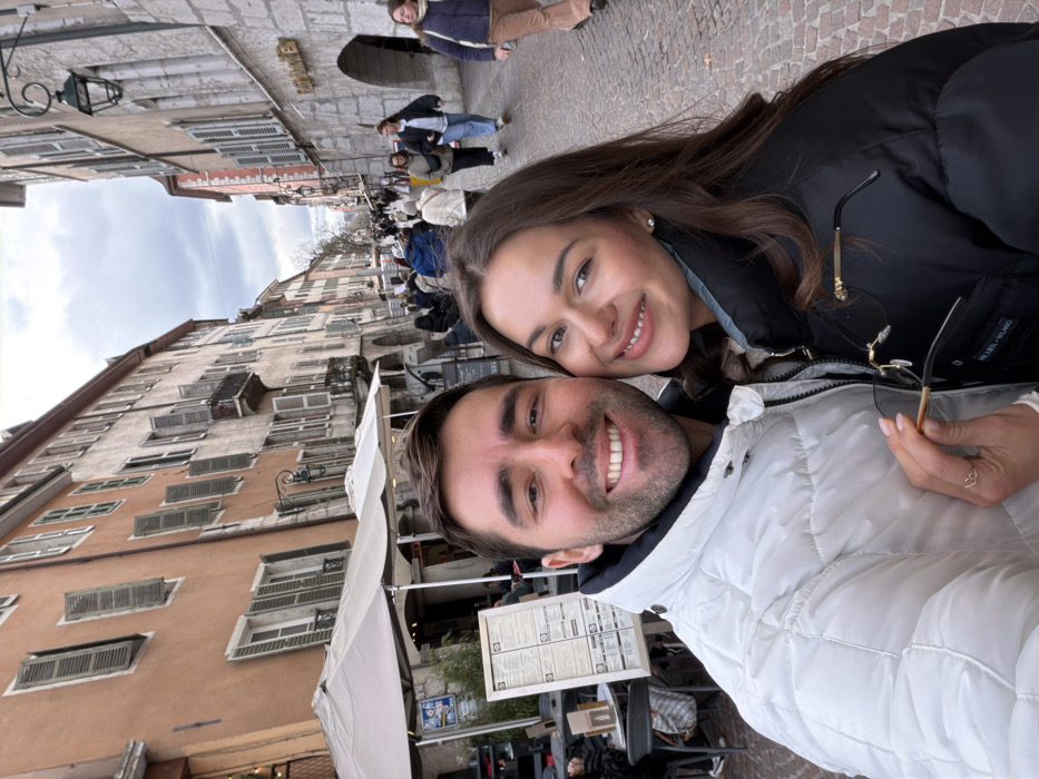 - "A male and female subject are positioned in the foreground, facing the camera with smiles, capturing a selfie on a cobblestone pedestrian street in Annecy, France" by FM-PcEqo1, licensed under CC BY 4.0