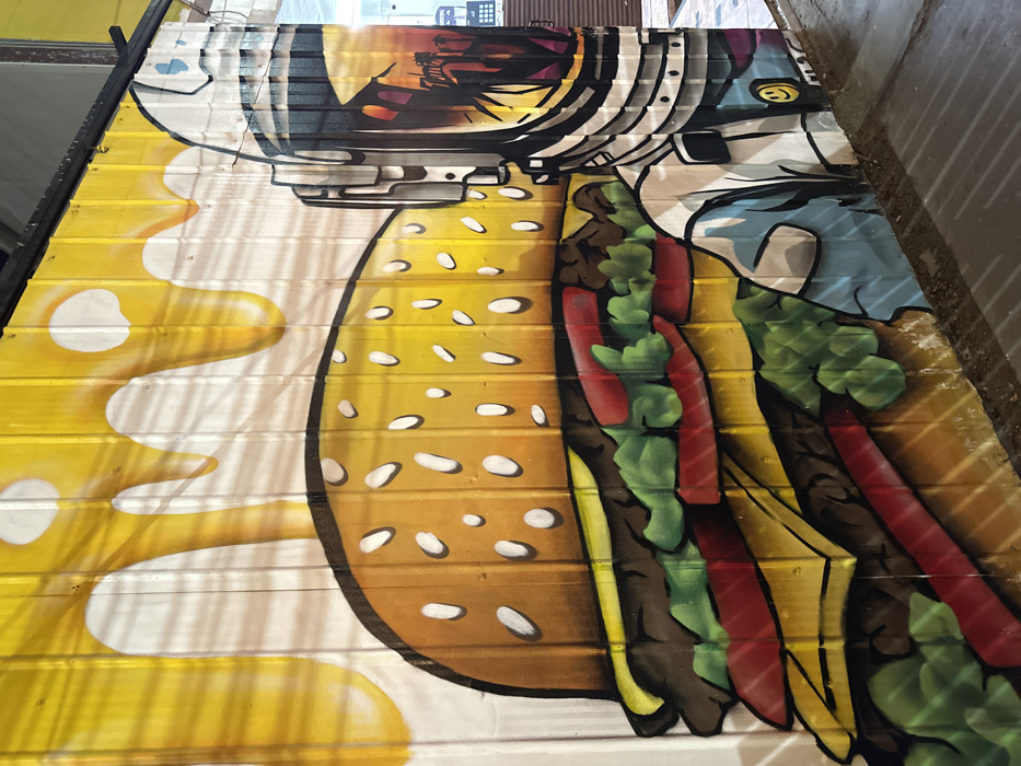 The image displays a mural painted on a corrugated metal wall in the city of Arica, Chile. The artwork depicts a large, multi-layered cheeseburger dominating the left and central portions, featuring a sesame seed bun, multiple patties, melted cheese, green lettuce, and red tomato slices. Above the burger, abstract yellow drip patterns are painted on a white background. To the right, the upper torso and helmet of an astronaut in a white and blue space suit are visible, rendered in profile and facing left. The astronaut's helmet visor reflects a silhouetted cityscape against an orange and yellow sky, suggesting a sunset or sunrise. A small yellow smiley face icon is present on the lower right section of the astronaut's suit. Diagonal shadows from an unseen overhead structure are cast across the upper wall and horizontally across the concrete ground in the foreground. A brightly illuminated interior or adjacent section of a building is partially visible in the far right background. No individuals or dynamic actions are present within the frame.