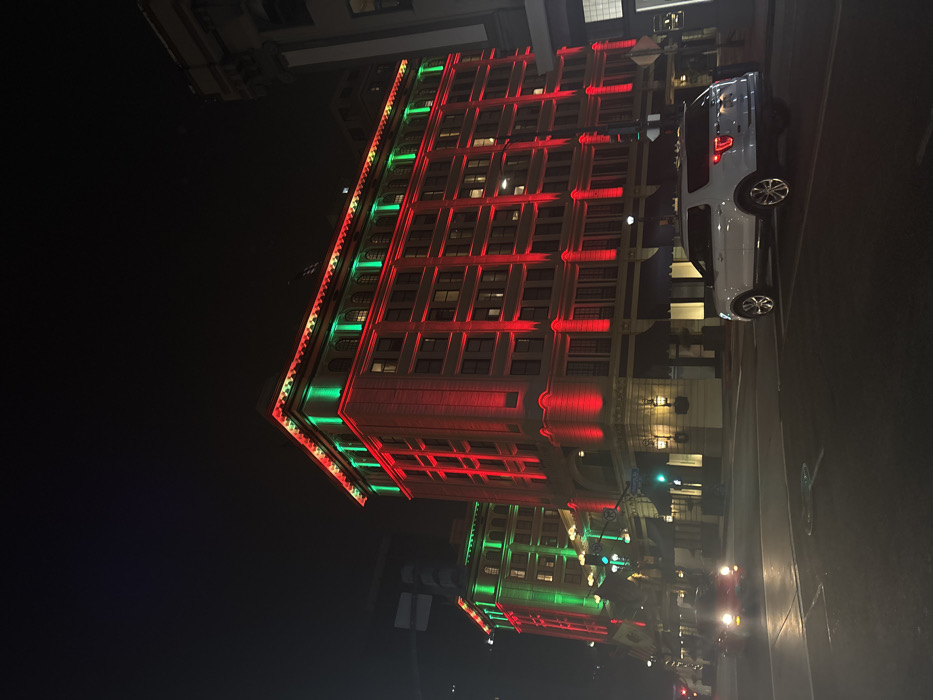 - "A tall building is illuminated with green and red lights, reminiscent of Christmas decorations" by FM-97btd2, licensed under CC BY 4.0