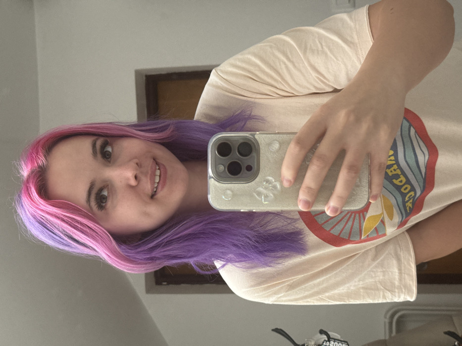 A young female is depicted in a mirror selfie, standing indoors within a room located in the City of Zagreb, Croatia. She has long, wavy hair, colored bright pink at the roots and transitioning to a vibrant purple along its length. Her face is oriented towards the camera with a slight, closed-mouth smile, revealing upper teeth. She has dark eyes and wears visible false eyelashes. She is wearing a light-colored, short-sleeved t-shirt featuring a large, multi-colored circular graphic design on the chest, which includes elements resembling a sun, waves, and partially visible inverted text. Her right hand, with a visible ring finger, holds a light-colored smartphone equipped with a clear, possibly glittery, case that displays small decorative bow-like elements. The phone's triple-lens camera module is prominently visible on its back. The background consists of plain, light-colored walls. A dark object hangs from a hook on the upper left, and a white pipe or radiator element is visible in the lower left. A dark rectangular shape, appearing to be a door or doorframe, is visible behind her left shoulder. The scene is evenly lit.