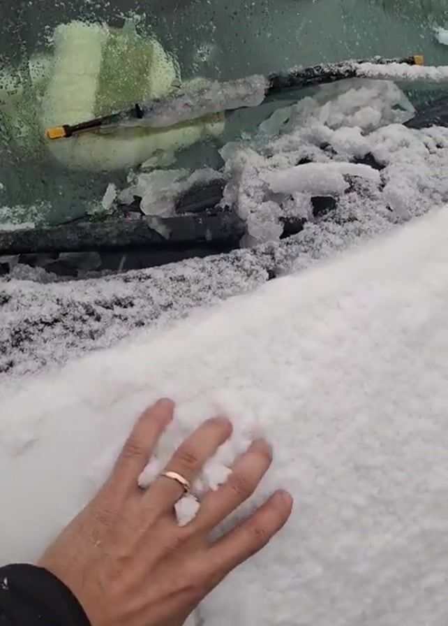 A hand pats and picks up snow on the hood of a car in the video. The car is covered in a thick layer of snow, and the windshield wipers are visible under the snow. The hand is light-skinned and has a gold ring on the ring finger.
