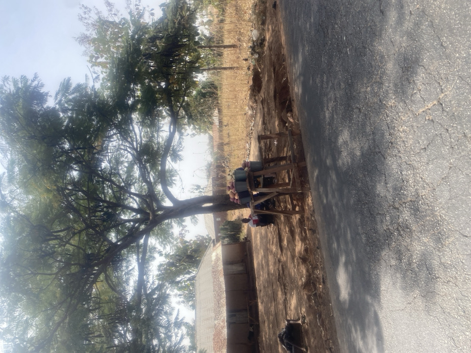 A roadside stand displays produce beneath a tree's shade. Buckets overflow with goods. A person sits nearby, partially obscured. Adjacent to the stand is a gray, cracked road. Beyond the stand, dry grassland stretches toward a distant horizon. A low building with a corrugated metal roof is also visible. The scene is bathed in sunlight, creating a hazy, rural landscape.