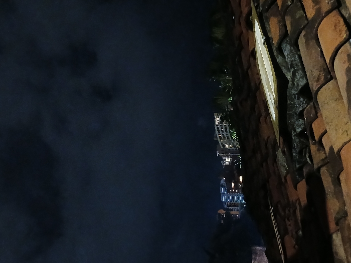 A nighttime scene depicts a dark, cloudy sky to the left. To the right, a section of a building with orange clay tiles and a small, vertical window is visible. In the distance, between the two, a tall, illuminated building or structure stands amidst the darkness, suggesting a city skyline at night.