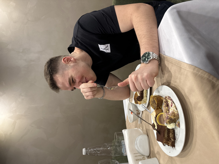 The image depicts an indoor dining scene at the Premier Luxury Mountain Resort in Bansko, Bulgaria. A light-skinned male, with short, dark hair and wearing a black Calvin Klein t-shirt, is seated at a table. He wears a silver chain bracelet on his left wrist and a silver watch with a green dial on his right wrist. His left hand holds a fork with food near his mouth as he smiles, while his right hand displays a "thumbs-up" gesture. The table is draped with a white tablecloth and a beige runner. In front of the subject, a white oval plate contains multiple dessert portions, including a slice of tiramisu, a cake with a yellow topping, a partially eaten streusel cake, and a small brown cake. A separate small white plate holds a chocolate tart. A small white bowl contains strawberries. Additional table items include a clear water bottle and napkins, both branded "PREMIER", a white ceramic shaker, and several empty glasses. The background consists of a light beige, textured wall.