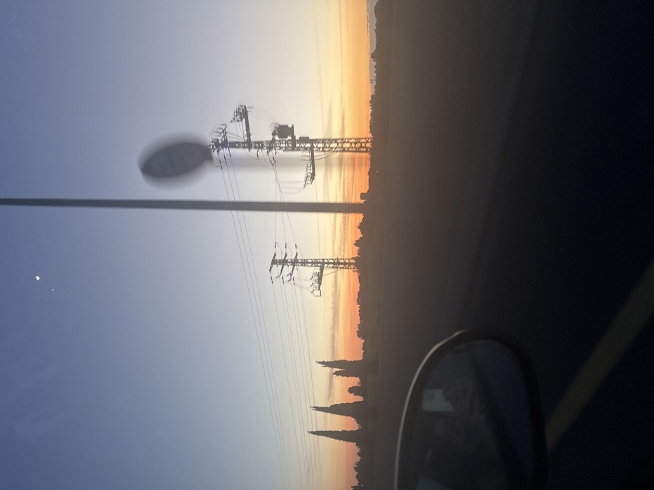 The image depicts an outdoor twilight scene, likely sunset, observed from a moving vehicle in Rishon LeZion, Israel. The sky transitions from deep blue at the top to orange and yellow at the horizon, with two distinct bright celestial objects (likely the Moon and Venus) visible in the upper left quadrant. The foreground features a blurred, dark road surface with a faint yellow line on the lower left. A car's side mirror is visible in the lower left, reflecting a blurred individual holding a smartphone. The midground includes a line of dark, conical trees, resembling cypresses, on the left. Several large electricity transmission towers are prominent, with two distinct lattice structures visible on the right. A very tall, slender utility pole, heavily blurred by motion, extends vertically from the mid-right into the sky, partially obscuring the background. Power lines traverse horizontally between the towers. The background shows a faint silhouette of distant urban or semi-urban structures against the orange horizon. The overall scene exhibits significant motion blur, consistent with photography from a vehicle traveling on a major highway or thoroughfare on the outskirts or within Rishon LeZion.