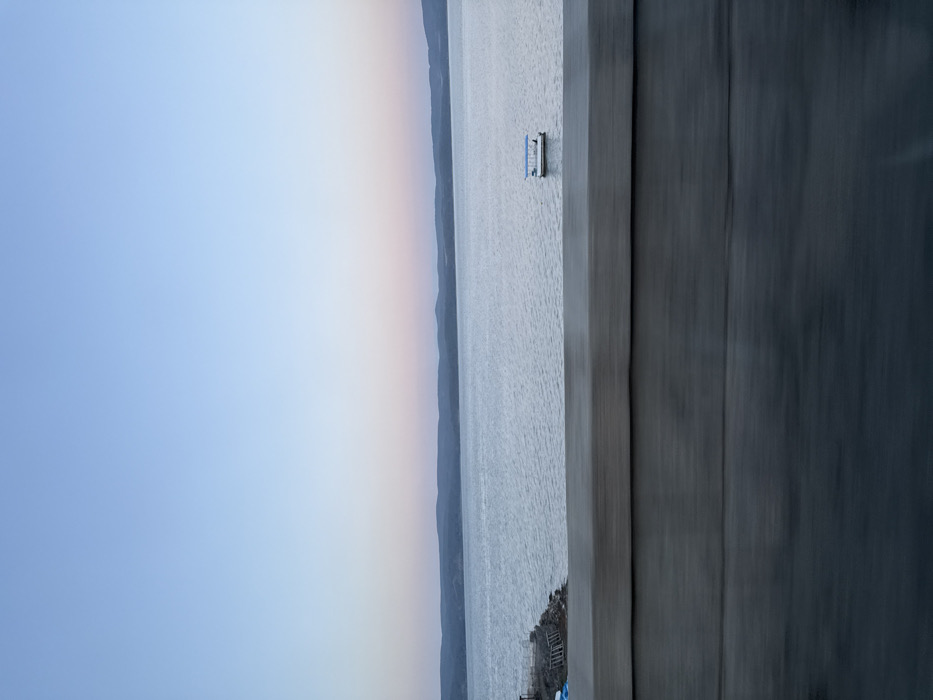 The image displays a wide view of a large body of water, identified as a reservoir near Dolni Pasarel, Bulgaria. The sky exhibits a gradient, shifting from light blue at the zenith to a soft pink and pale orange hue near the horizon, indicative of either dawn or dusk. Distant, undulating hills with a dark profile form the background. The water surface is calm, showing minimal ripples, and appears light blue-grey. On the left side, a section of shoreline is visible, comprising a rocky or earthen bank with several indistinct light-colored objects, potentially small boats or structures. Further right on the water, a single, small, flat-bottomed boat with a light blue canopy structure is present. Two small, dark, indistinct figures are visible on the boat. The immediate foreground is occupied by a blurred, horizontal grey-brown structure, consistent with a bridge railing or the lower frame of a vehicle window, suggesting the image was captured from a moving platform. There are no clear actions or interactions depicted among the figures on the boat; they appear stationary.