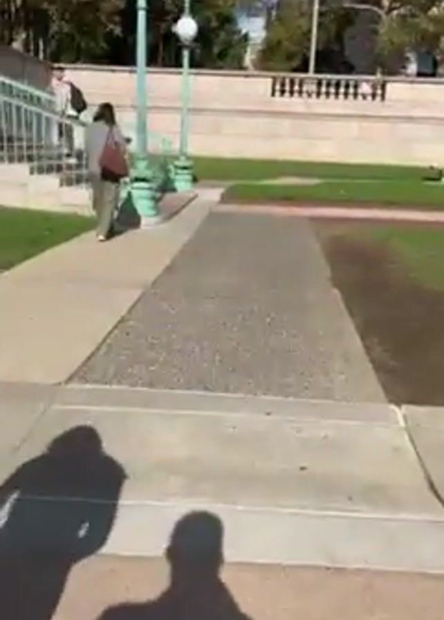 A person wearing a red shirt and light blue jeans walks along a concrete walkway, casting a shadow. To the right, there is a patch of green grass and a dark pool of water. To the left, there is a wall with a metal railing. In the background, people are walking up a set of stairs with decorative lamp posts. The camera follows the walking person, casting a shadow in the foreground. The scene appears to be in an outdoor public area.