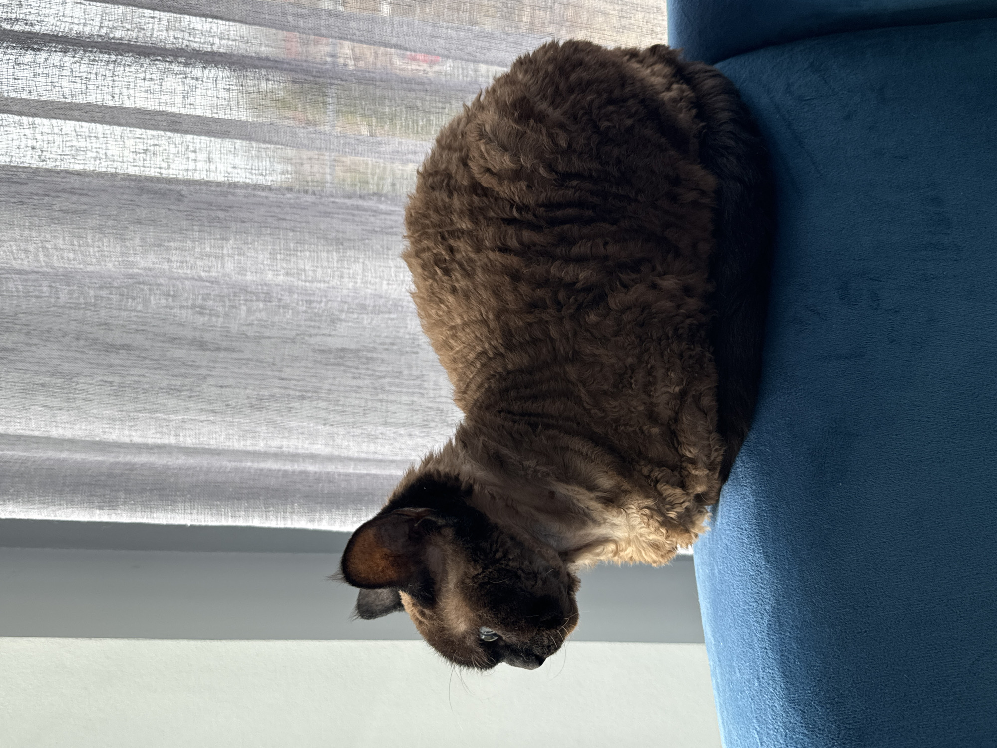 A brown cat with a curled coat sits atop a blue upholstered chair, facing down and left. Behind the cat, a semi-transparent window shade filters light from outside. The scene is well-lit.