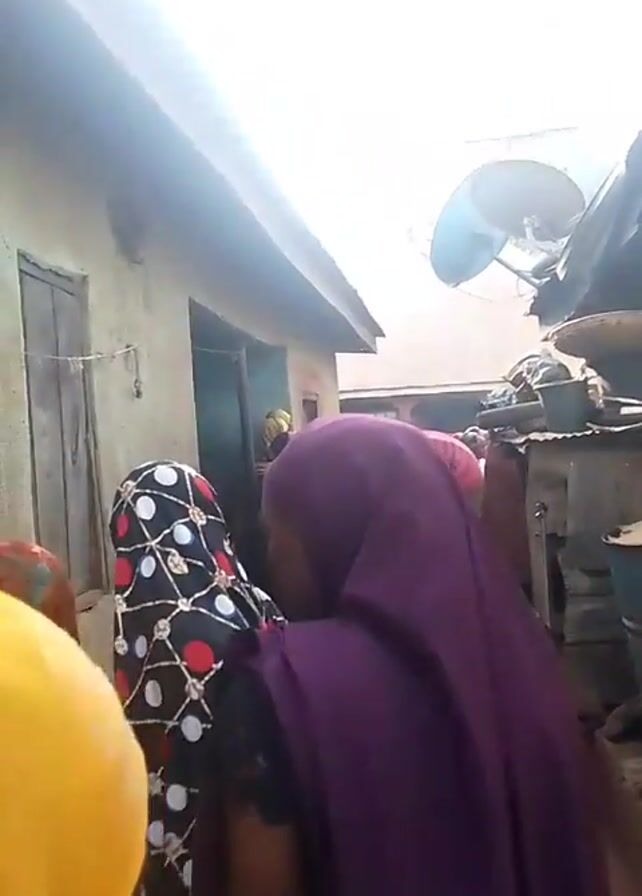 A group of people, mainly women, are walking down a narrow alleyway between buildings. They are wearing colorful clothes, including yellow, purple, red, and black-and-white patterned fabrics. The buildings are simple and appear to be in a residential area. There is a satellite dish visible on the roof of one of the buildings. The lighting is bright, suggesting it is daytime. The camera is positioned behind the group, capturing their movement through the alley.