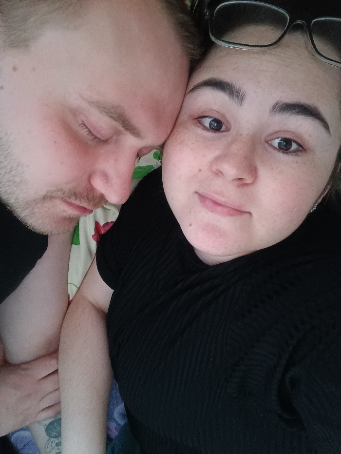 An interior close-up shot depicts two individuals, a male and a female, in an intimate pose, likely within a residence in the city of Посад, Russia. The male, positioned on the upper left, has fair skin, light stubble, and his eyes are closed; his head is resting against the female's. A black garment covers his upper torso, and his visible right forearm displays a dark, circular tattoo. The female, positioned on the lower right, has fair skin with freckles, dark hair, and dark eyes, looking directly at the camera with a neutral expression. Clear-framed eyeglasses are resting on top of her head. She is wearing a black ribbed short-sleeved top. The background consists of patterned bedding, including a light-colored sheet with red and green floral designs and a darker blue or purple fabric.