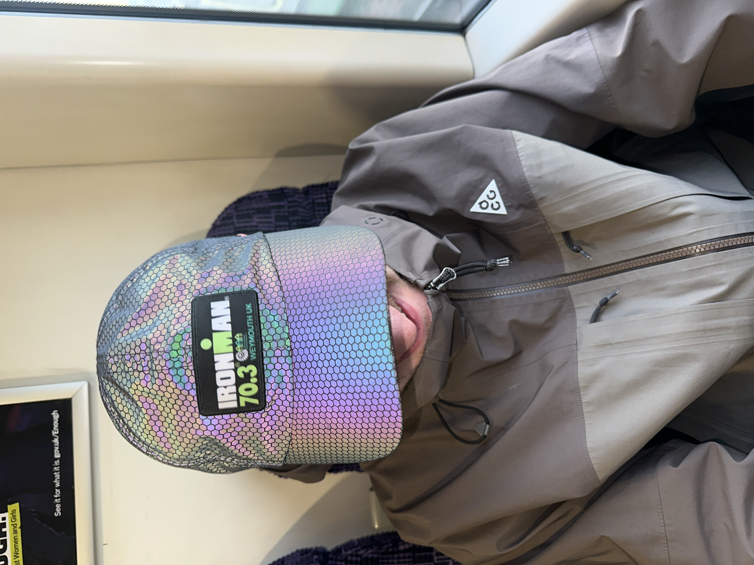 A passenger is seated within a train carriage in the United Kingdom, likely operating within the broader transport network connected to or within the city of London. The individual wears a highly reflective cap, patterned with hexagons and pulled low over the face, revealing only the mouth with the tongue slightly extended. A black patch on the cap reads "IRONMAN 70.3 WEYMOUTH UK". The person is dressed in a two-tone brown and taupe jacket featuring a central zipper with a black cord pull and a white triangular "AC.G" logo on the right chest area. The environment consists of upholstered dark seating, light-colored interior walls, and a window on the right side providing a blurred view of a green landscape. Above the passenger's head, a framed poster is visible, displaying text including "See it for what it is. gov.uk/Enough" and elements related to "Women and Girls," indicating a public awareness campaign.