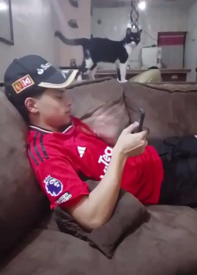 A person in a red Manchester United jersey and a black baseball cap lies on a brown couch, using a phone. A black and white cat stands on the back of the couch. The room has neutral wall colors and a visible reflection of lights. The couch has a brown pillow. The person is angled slightly to the left and engrossed in the phone.