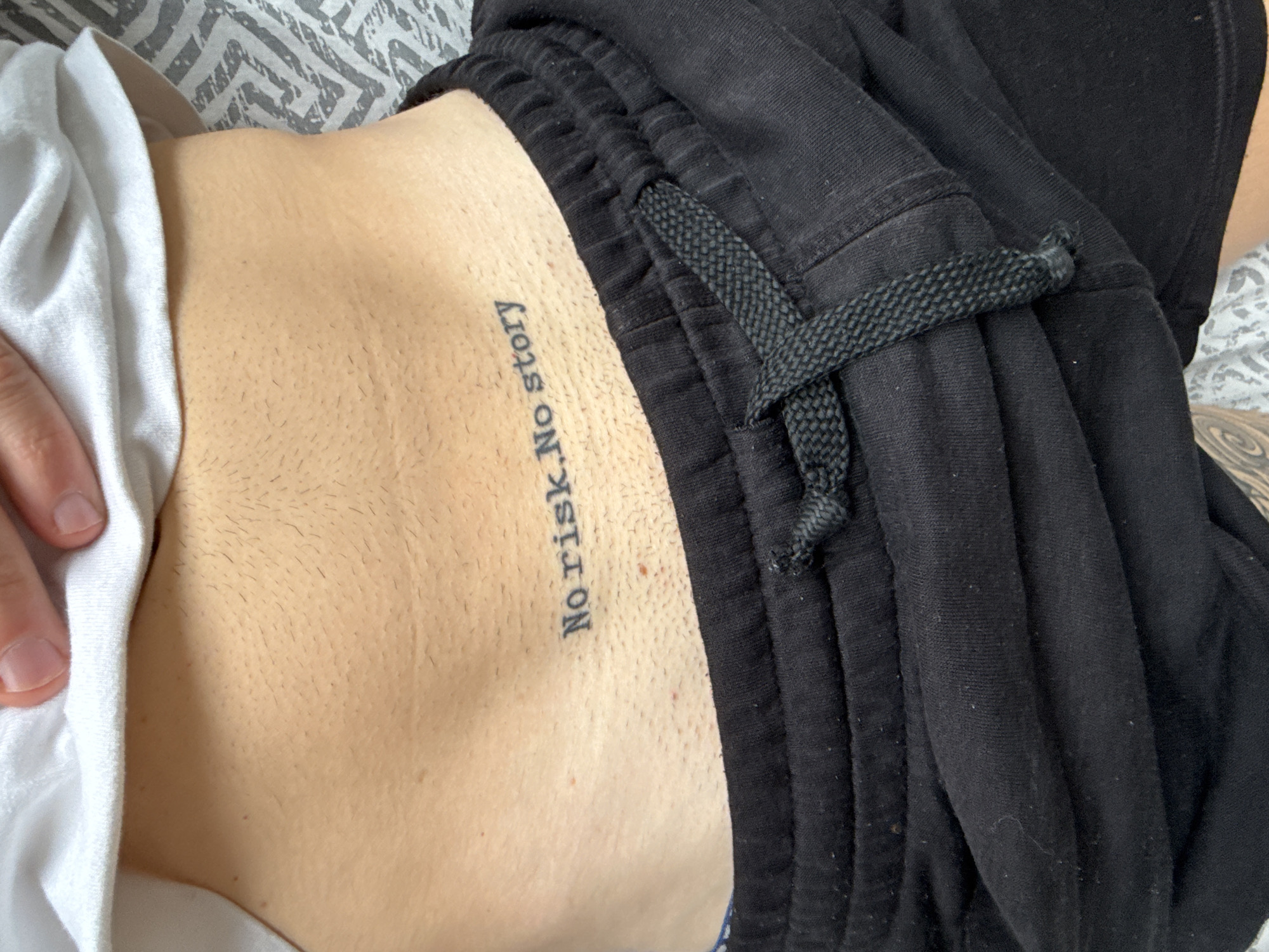 A close-up shot of a torso and upper thighs of a person is visible. The person has a tattoo reading "No risk. No story" running vertically on their skin. A white t-shirt partially covers the left side of the torso, with the person's fingers visible on the bottom left of the t-shirt. The person is wearing black sweatpants or shorts. The background shows a patterned bedsheet. The location is unknown but claimed to be Sofia, Bulgaria.