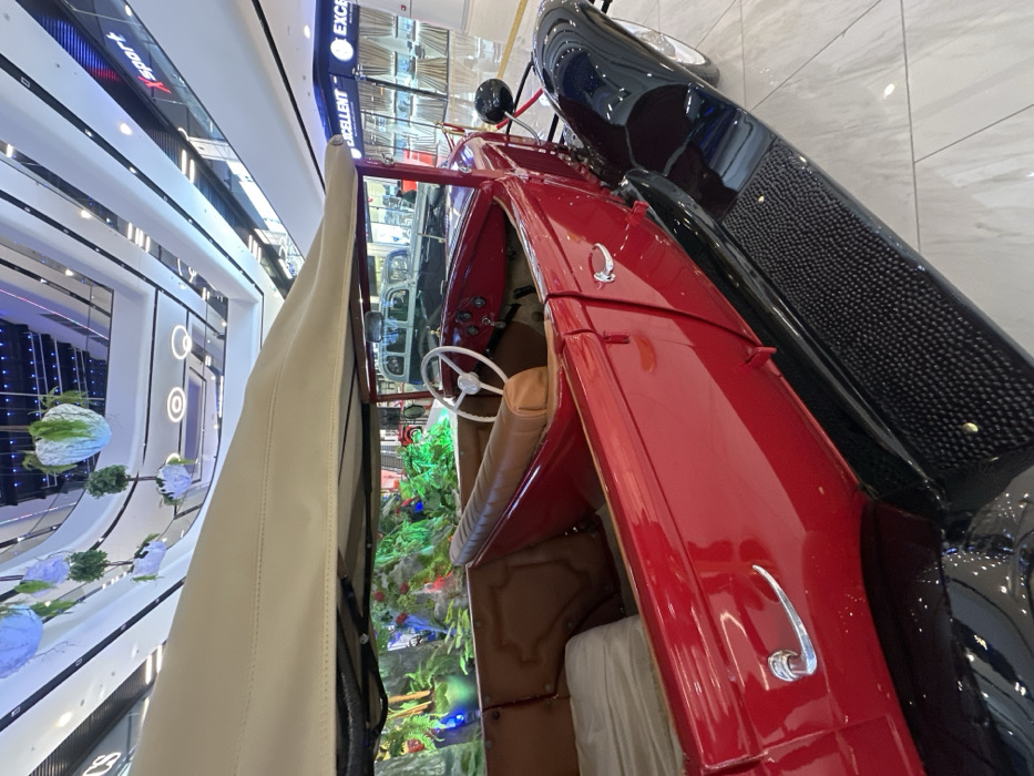A vintage, deep red convertible touring car with a beige soft top is centrally positioned indoors on a polished white tiled floor. The vehicle displays black fenders, textured black running boards, chrome door handles, and an interior with brown upholstered seating and a white steering wheel. To the car's left, a decorative display simulates a natural environment with artificial foliage, illuminated rocks, and blue lighting. Further in the background, other classic automobiles, including a light-colored vintage van, are visible on exhibit. To the right, beyond the car display, storefronts are discernible, featuring "Xsport" and "Excellent" signage. The setting is a multi-story modern shopping mall in Tashkent, Uzbekistan, characterized by its bright white interior, multiple levels with glass railings, and decorative hanging planters. No individuals are visible near the vehicle.