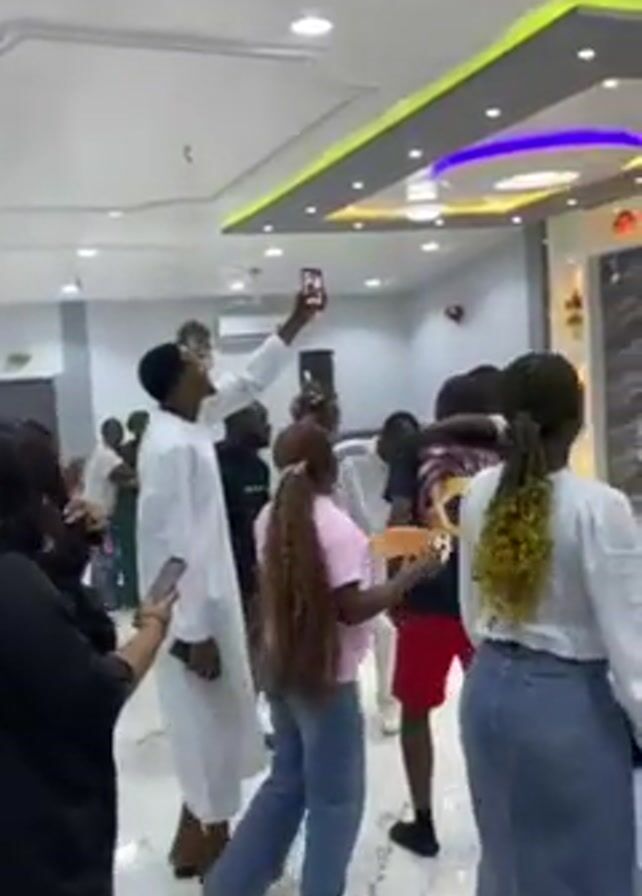 group of people dancing and enjoying themselves in a large, well-lit hall. Some people are taking videos with their phones, while others are clapping and cheering. The atmosphere appears celebratory. The hall has a modern design, with a decorated stage area in the background. Many people are standing and watching, seemingly enjoying the music and dancing. Chairs are lined up in rows, indicating a possible event or gathering. The people are diverse in age and appearance, dressed in casual and semi-formal attire.