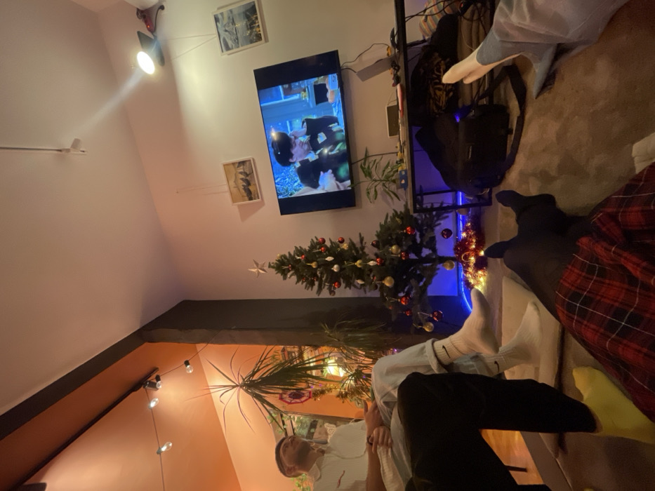 An angled view shows a living room with a Christmas tree and lights. A person sits casually, wearing black pants, white socks, and a white shirt. A TV displays a scene, and pictures hang on the wall. Soft lighting illuminates the room, creating a cozy atmosphere. Plaid fabric is visible, likely clothing or a blanket. Additional potted plants and string lights decorate the space, enhancing the festive mood.