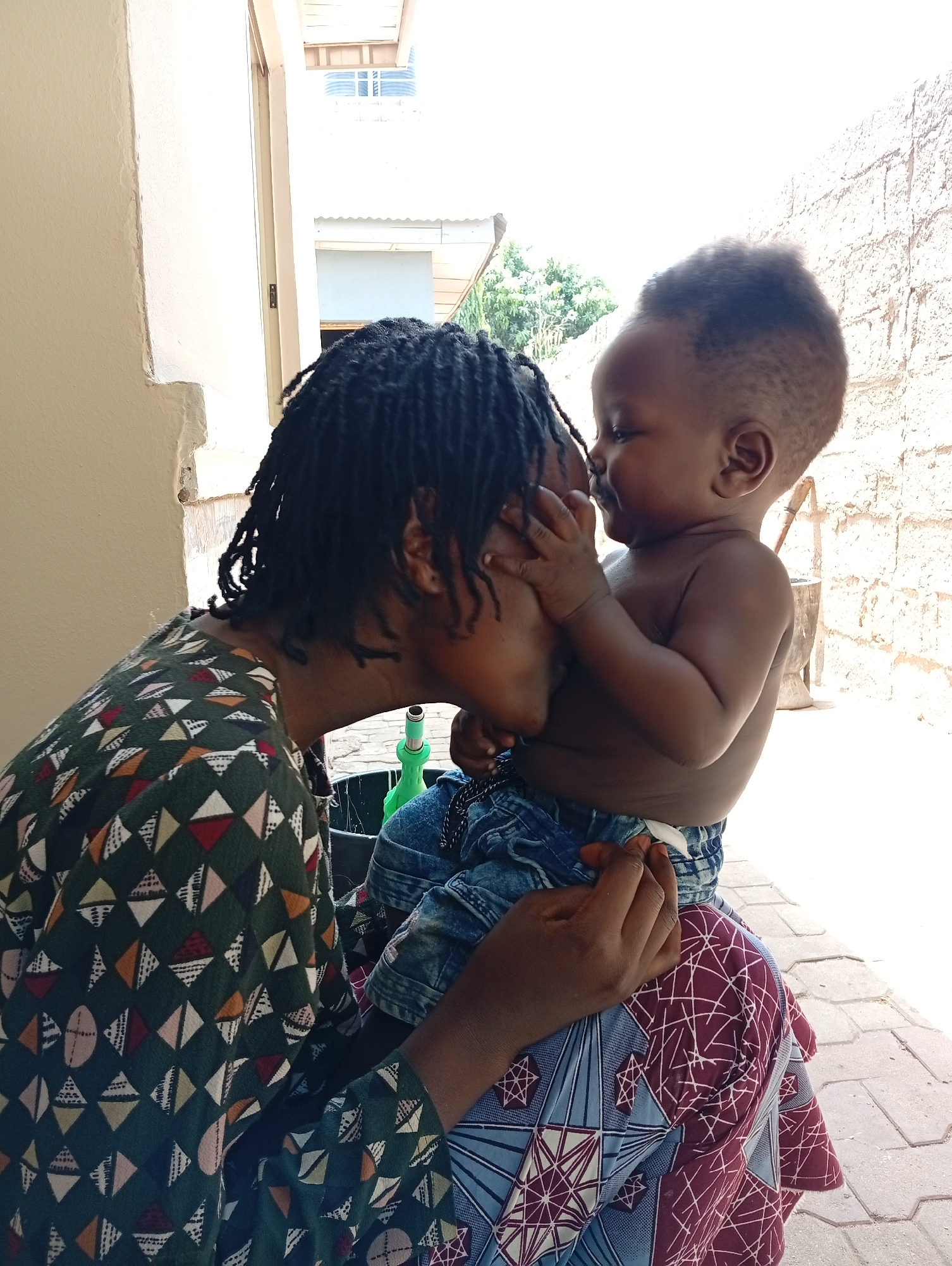 An adult individual, exhibiting dark skin and black dreadlocks, is depicted in profile on the left, wearing a dark green top with multi-colored geometric patterns and a blue and maroon patterned skirt. The individual is leaning forward, with lips near the left cheek of a baby. The baby, also with dark skin and short dark hair, is seated on the adult's lap, wearing blue denim shorts. The baby's hands are positioned on the adult's face. The setting is outdoors during daylight hours. To the left, a light-colored building wall is visible, featuring a window frame, wooden roof beams, and a blue water storage tank on a rooftop. To the right, a wall constructed of light-colored, rough concrete blocks or bricks extends, with green foliage visible beyond it. The ground is paved with light-colored rectangular pavers. A green plastic container and a black bucket are partially visible behind the adult. The location is in the city of Unknown, Unknown.