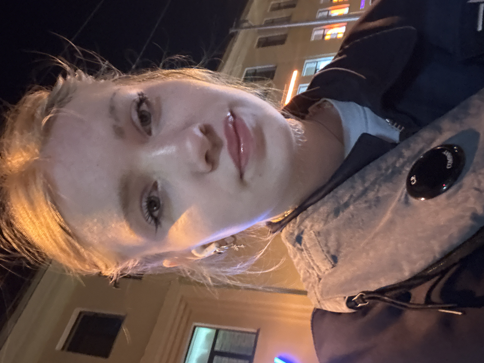 A low-angle selfie of a fair-skinned young woman with blonde hair outdoors at night. Her lips are glossy, and she is wearing mascara. To her right is a dark-colored jacket with a light gray padded shoulder strap and a round black logo button that says "C.P. COMPANY". Behind her are buildings with illuminated windows. Based on the architectural style of the buildings, it is likely that this photo was taken in Saint Petersburg, Russia. The overall scene suggests the woman is a pedestrian standing in an urban area after sunset.