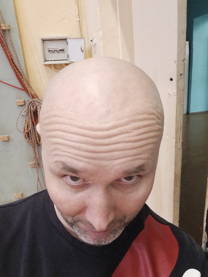 - "This image, captured in an interior setting in Sarapul, Russia, features a close-up of a bald, light-skinned adult male" by FM-F2yRz1, licensed under CC BY 4.0