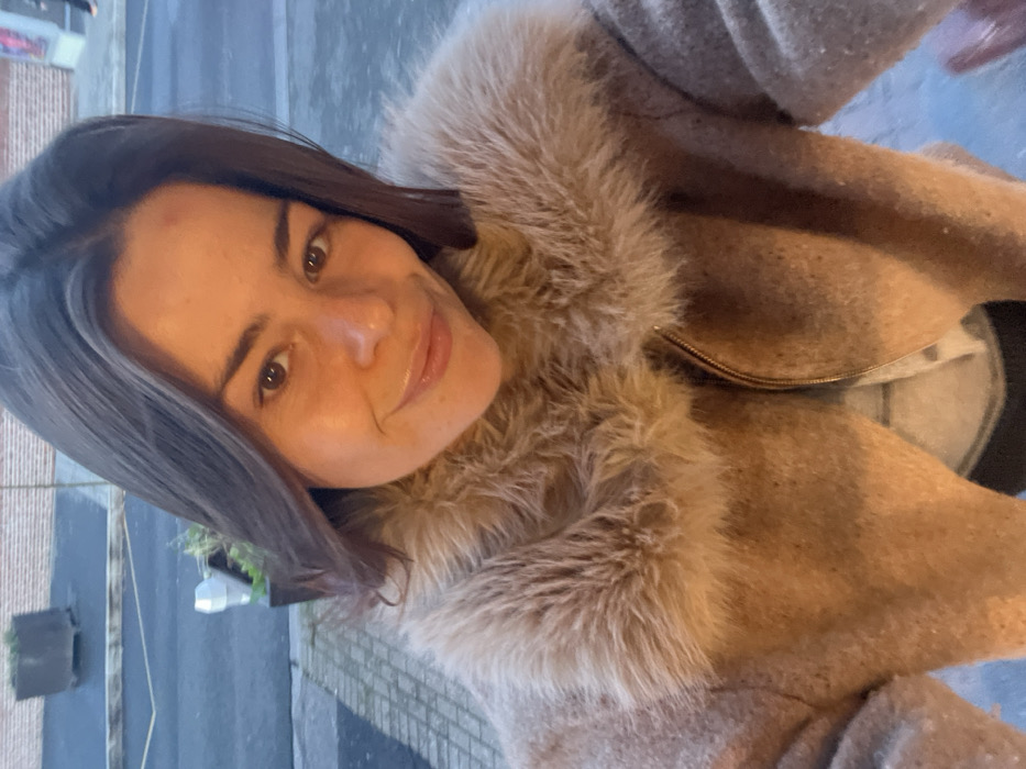 A single female individual is depicted in a close-up, high-angle selfie taken outdoors in Villeneuve-d'Ascq, France. She possesses dark brown hair and fair skin, with a visible light mole on her forehead, and is looking directly at the camera with a slight smile. She wears a tan or light brown jacket featuring a prominent, fluffy faux fur collar in a lighter beige hue. A golden metallic zipper is partially visible down the front of the jacket, with a lighter, possibly grey, garment visible underneath. The background shows an urban environment at what appears to be dusk or dawn, characterized by dim, ambient lighting. A dark asphalt road with faint yellow markings occupies the lower background, adjacent to a light-colored paved sidewalk. On the sidewalk, two dark, square-shaped planters containing green foliage are positioned. Behind these, a reddish-brown brick wall is partially visible, indicating a building facade. No other persons or significant actions are present in the visible scene.