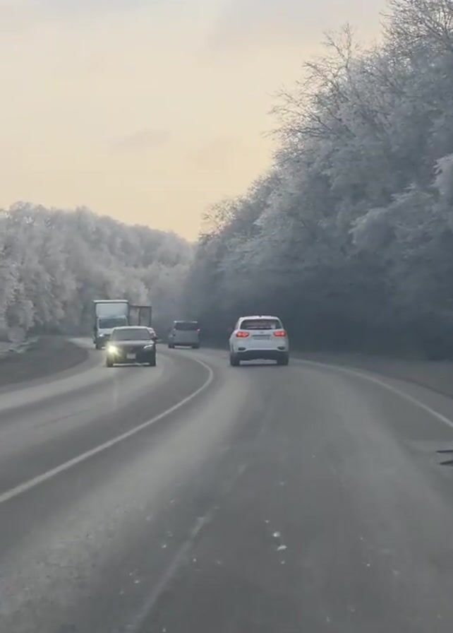 vehicle driving on a road on a cold, overcast day. The road is partially wet and surrounded by trees covered in frost or snow. Other vehicles are visible on the road ahead, including cars and trucks. The video is taken from inside the moving car, looking forward through the windshield. The scene is indicative of winter conditions on a highway.