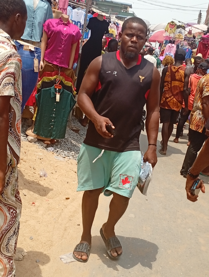 The image depicts a crowded outdoor market scene in Fegge, Nigeria, under bright daylight. In the foreground, an adult male with dark skin, short dark hair, and a trimmed beard stands facing the camera. He wears a black sleeveless V-neck shirt with red trim, a white symbol on the left chest, and a yellow stylized "K" (Kobe Bryant logo) on the right chest. He is dressed in light blue shorts with a white drawstring and a red maple leaf graphic on the left leg, and grey slip-on sandals. His left hand holds a dark-colored smartphone, and his right hand holds a white plastic bag containing unidentified items. He maintains a neutral expression while looking directly forward. To the left, partially visible, is the back of another adult male, wearing a light-colored, short-sleeved shirt with brown and white patterns. The background reveals a bustling market environment. Several mannequins display clothing items; one wears a light blue shirt and blue jeans, another a pink short-sleeved shirt, and a third a black dress. Multiple shirts (red, black, green with a tag) are hung on display racks below the mannequins. Further into the background, numerous individuals are visible, walking and congregating among various market stalls. Colorful umbrellas, characteristic of street vendors, are visible over some stalls. The ground transitions from a sandy, light-colored surface on the left to a grey paved path on the right. Small pieces of debris are scattered on both surfaces. Strong shadows are cast on the ground, indicating direct sunlight.
