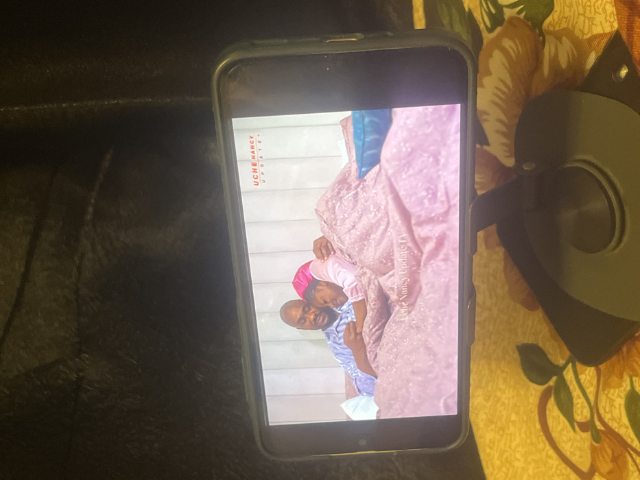 A smartphone displays a video from "Uche Nancy Updates TV." A man and a child, possibly a father and daughter, are cuddled under a pink lace blanket on a bed. The man wears a light blue shirt and the child is in a pink shirt. The phone rests on a black leather-like surface, partially covering a floral patterned cloth on a table next to a black stand.