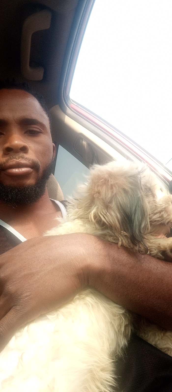 The image depicts an adult male and a small dog inside a vehicle, located in the city of Sabojibi, Nigeria. The male, with dark skin, a beard, and short dark hair, is visible from the chest up, looking directly towards the viewer with a neutral expression. He is wearing a dark top with light-colored trim. A light-colored, shaggy-furred dog, possibly a Shih Tzu or similar breed, rests on his left arm and shoulder area, facing away from the camera. The dog's fur appears slightly matted or wet in parts, with lighter beige tones predominating. The interior of the vehicle is partially visible, showing a light-colored headliner grab handle on the left side and a portion of a car seat. A bright, overexposed white sky is visible through the passenger side window, suggesting daylight conditions. The vehicle's window frame shows a reddish-brown trim. The man's right arm is partially visible, supporting the dog.