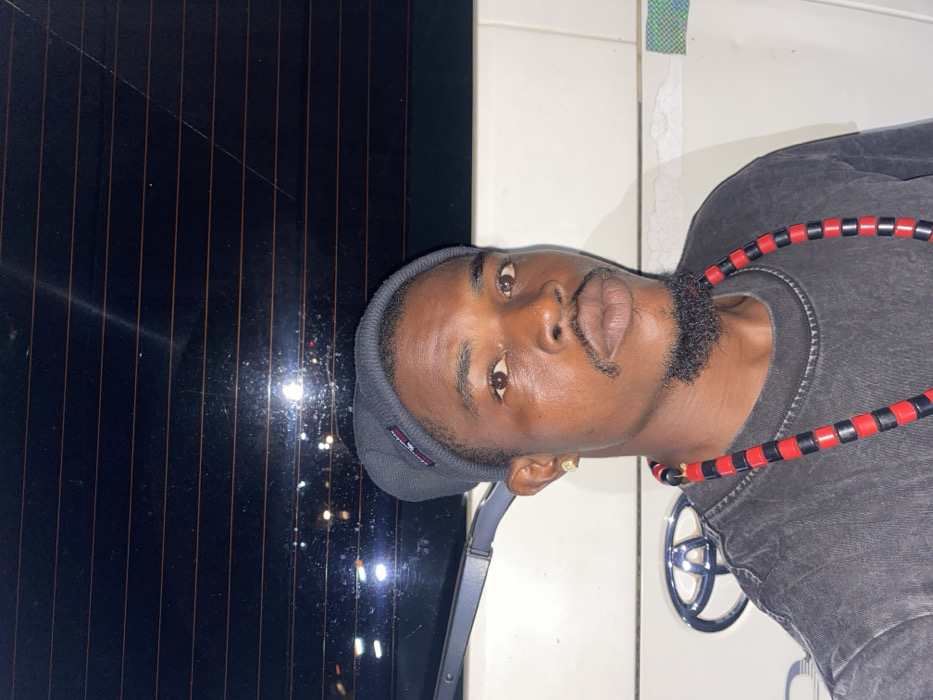A man poses in front of a dark car window reflecting city lights and a white background with a chrome emblem. He is wearing a dark gray beanie, a washed black shirt, and a black and red beaded necklace. He has short, dark hair, a small goatee, and a gold ring on his left hand. He is looking directly at the camera with a neutral expression. A dark strap is visible near his shoulder.