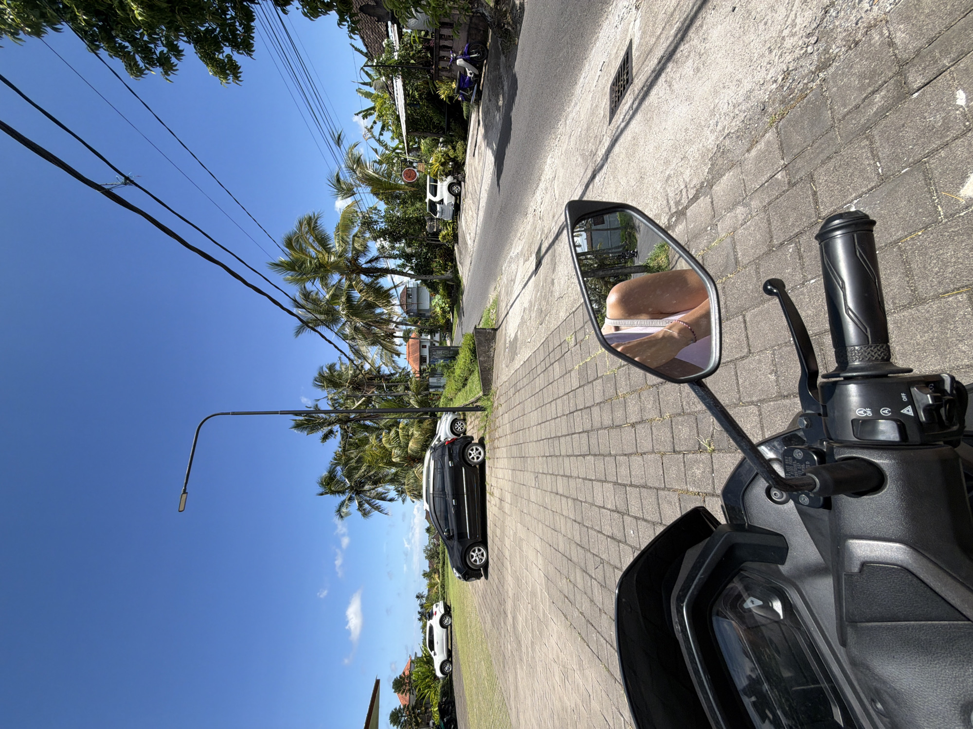 A medium, eye-level shot from the rider's perspective on a parked motor scooter in Ubud, Indonesia. The rider is not visible directly but their legs are reflected in the scooter's side mirror. The scooter is parked on a brick-paved area next to a street. The street is flanked by tropical trees and houses. Cars are parked along the street. A blue sky with scattered clouds is visible above the trees and buildings. Electrical wires run across the sky. A street light pole is also visible.