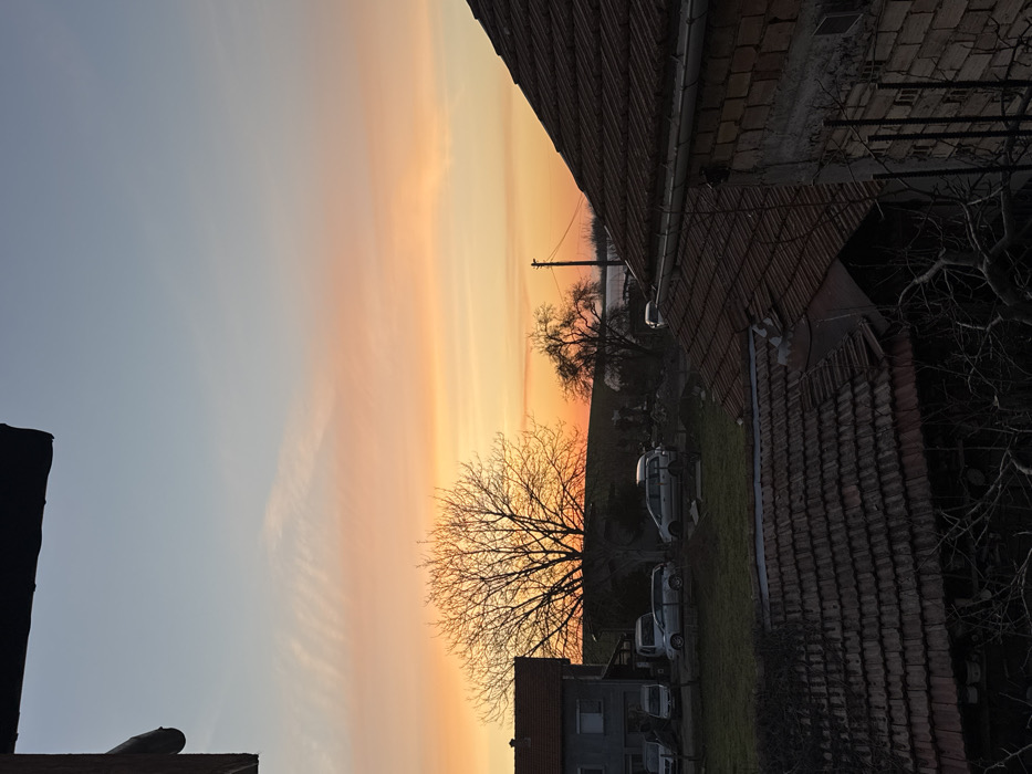 The image displays a static, rural or semi-rural scene in Polikraishte, Bulgaria, captured during either sunrise or sunset. The upper two-thirds of the frame are dominated by a clear sky, exhibiting a horizontal color gradient from vibrant orange-yellow at the horizon, transitioning through soft pinks, to a pale blue at the zenith. Wispy, horizontal cloud formations are present, particularly in the upper left quadrant. In the immediate foreground, the dark silhouette of a building's eaves with a visible gutter is present at the top left. The bottom right features the reddish-brown tiled roof of a building, equipped with a light-colored gutter. Below this roof, a section of a light-toned brick or block wall is visible, partially obscured by bare, gnarled tree branches in the extreme bottom right. To the left, a portion of another reddish-brown tiled roof is discernible. The midground includes a grassy area where multiple vehicles are parked, specifically a white utility van and at least two silver-colored station wagons or hatchbacks. To the left, a two-story residential structure with light-colored walls and a partially visible reddish roof is present, showing two dark-framed windows on its upper level. A large, leafless deciduous tree stands centrally, its intricate branch network silhouetted against the bright sky. Further right, a smaller, similarly bare tree is visible. A utility pole with overhead wires is positioned to the right of the smaller tree, with a distant body of water, likely a river or lake, visible beyond it. The background consists of a dark, gently rolling hill line against the brightly illuminated horizon. No individuals or discernible activities are observed within the frame. The bare trees suggest a seasonal context of late autumn, winter, or early spring.