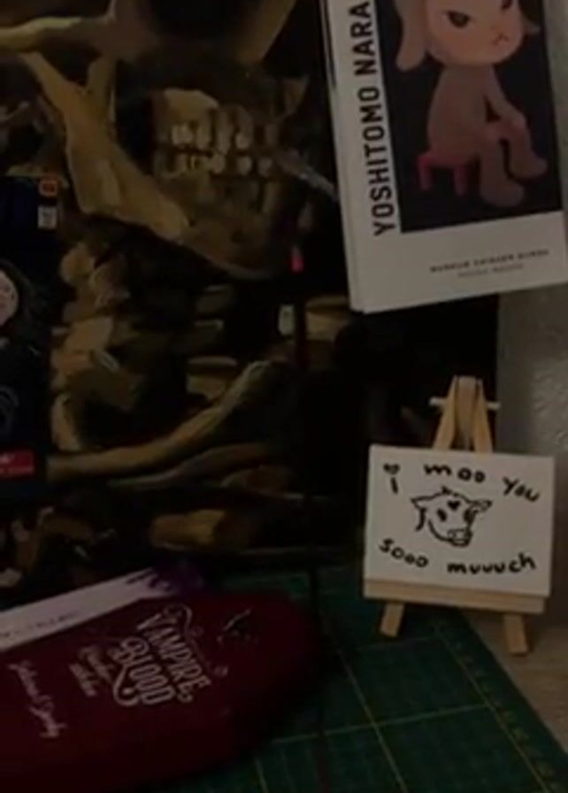 The video presents a still life arrangement on a cutting mat. At the back, a painting depicting a skull dominates. To its right, a postcard featuring art by Yoshitomo Nara leans against the wall. In front of the painting, an incense stick burns from a holder that sits on a small tombstone engraved with "RIP". Adjacent to the incense, a coffin-shaped box labeled "Vampire Blood" rests. A tiny easel displays a drawing of a cow, accompanied by the phrase "I moo you sooo muuch". The scene appears to be staged with a gothic or whimsical theme.