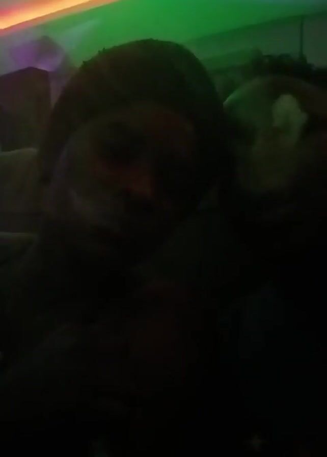 Two people are sitting close together in a dark room with overhead lights. The lights flash green and blue. One person is wearing a hat. Smoke is visible coming from a hookah. One person takes a drag.