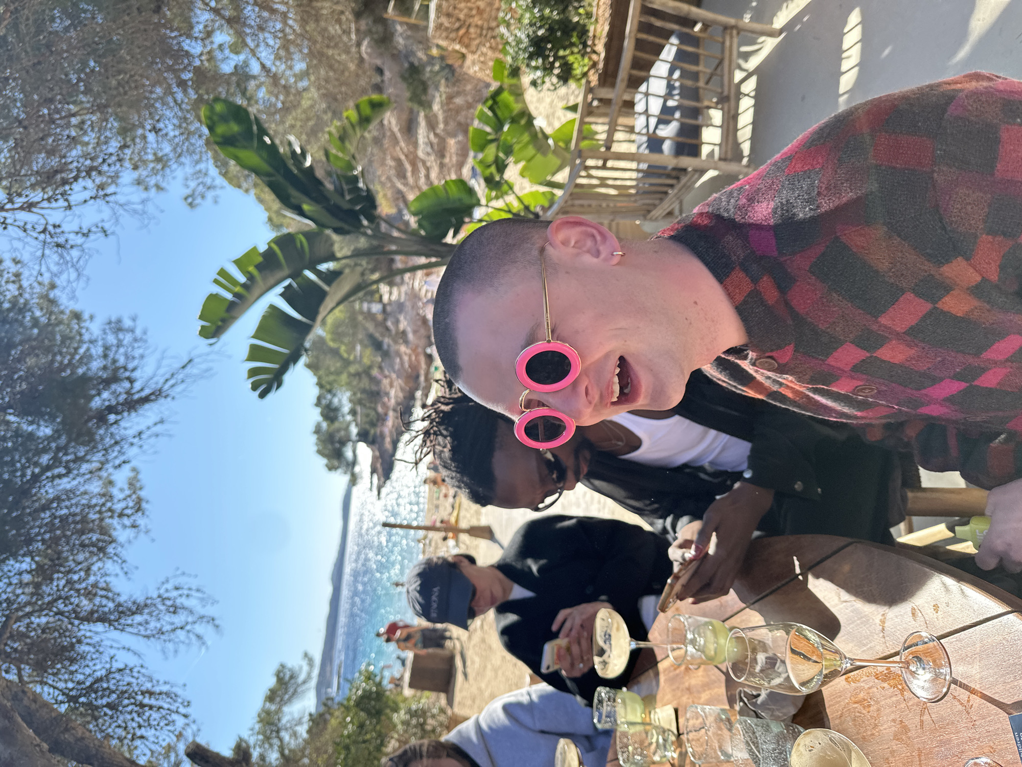 Captured from a rotated perspective, the image depicts a group of people seated around a wooden table outdoors, suggestive of a beachside or coastal location. The foreground features a person with a shaved head and pink sunglasses, wearing a patterned shirt, and smiling towards the camera. Behind them, other individuals are visible, some with sunglasses and casual attire. The table is occupied by multiple wine glasses. In the background, the scene transitions to a coastal landscape, including a body of water, sandy beach, vegetation, and rocky terrain. Based on the location information, the scene is in Sant Antoni de Portmany, Spain.