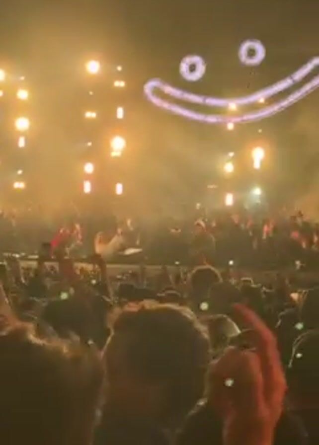 A crowd of people are at a concert at night. The audience is raising their hands and recording with their phones. The stage is brightly lit with spotlights and an LED display in the shape of a smiley face. A performer stands on the stage in front of the crowd. The atmosphere is filled with smoke and excitement.