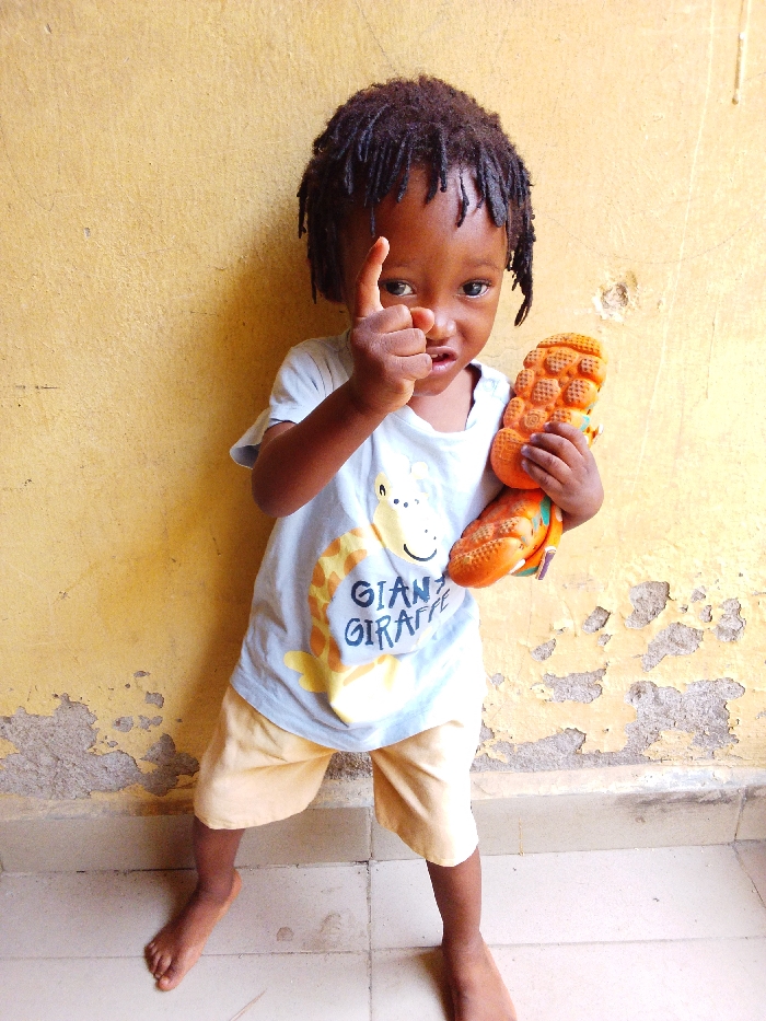 A young child with dark skin and short dreadlocks stands against a textured, peeling yellow-orange wall within Zango-ndaji, Nigeria. The child wears a light blue t-shirt featuring a yellow giraffe graphic and the text "GIANT GIRAFFE," along with light yellow shorts. The child is barefoot on a tiled floor. The child's right hand is raised, with the index finger pointing upwards. In the left hand, the child holds an orange, textured shoe or sandal. The child looks directly at the camera with a slight smile.