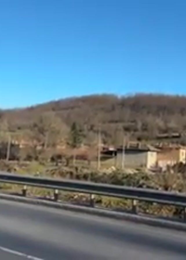 view from a road, across a guardrail, toward a village or small town. The road is paved and appears to be in good condition. The guardrail is metal and runs along the edge of the road. Beyond the guardrail is a slightly elevated area with several houses. The houses are mostly single-story, with a mix of grey and tan exteriors and red tile roofs. Behind the houses, a densely wooded hillside rises. The trees are bare, suggesting it is either winter or early spring. The sky is clear and blue. The overall impression is of a rural, somewhat isolated settlement. There is no visible movement of people or vehicles.