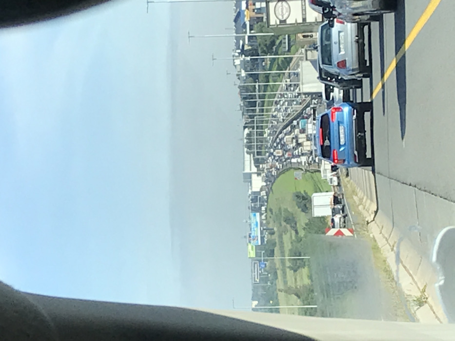 Heavy traffic stretches into the distance on a highway, with many cars packed closely together. A grassy area and billboards flank the side of the road. A blue car is visible in the foreground, along with other vehicles. Overhead streetlights are present. The sky is light blue, suggesting it is daytime.