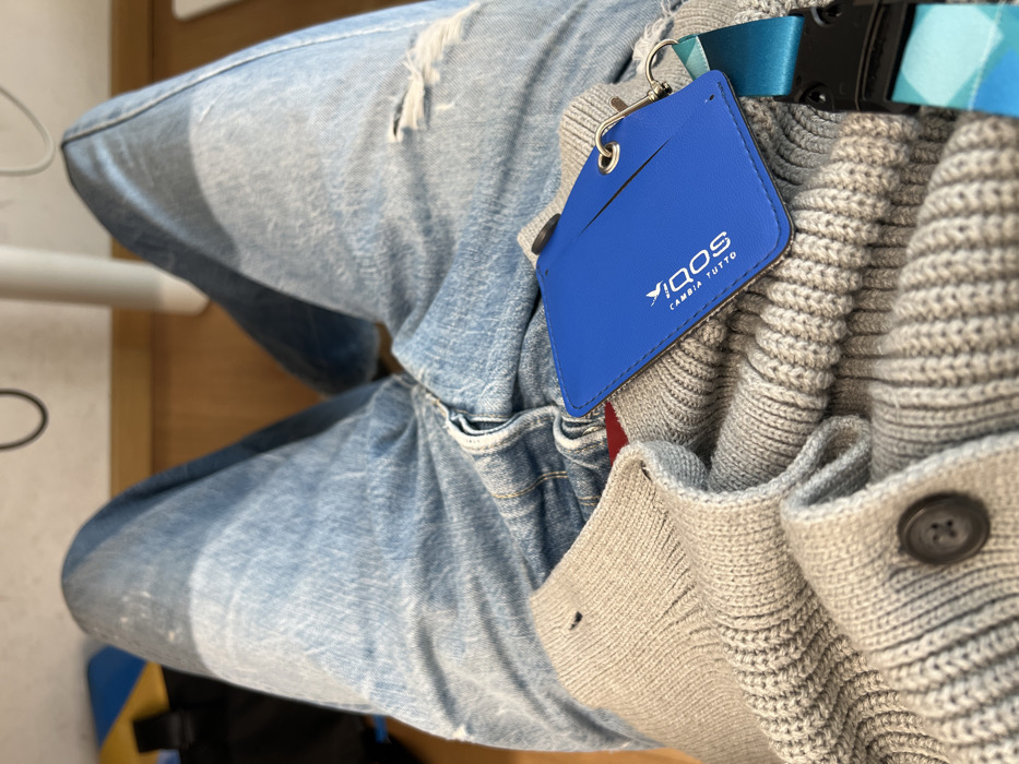 A first-person, downward-facing view captures the lap of an individual seated in an indoor setting in Valsamoggia, Italy. The individual wears light blue, distressed denim jeans with visible fading and a tear on the right thigh. A light grey, ribbed knit cardigan with a visible dark grey button is layered over a partially visible red garment. Resting on the cardigan is a rectangular, bright blue faux leather tag, approximately 8cm by 5cm, embossed with "IQOS" and "CAMBIA TUTTO" in white text. This tag is attached via a silver-colored carabiner clip to a multi-toned lanyard, featuring blue and turquoise patterning and a black plastic buckle. The immediate background is blurred, showing a light brown floor, a partial yellow and blue object to the left, and a white vertical element to the right.