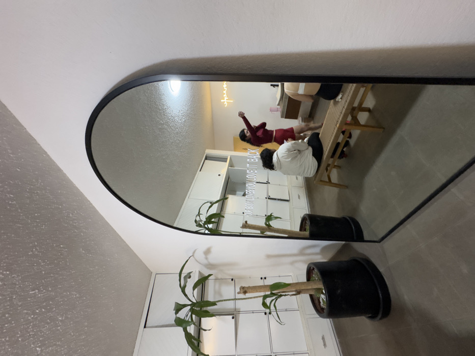 The image depicts an interior scene, likely a fitness studio or changing area, located in Cuernavaca, Mexico
