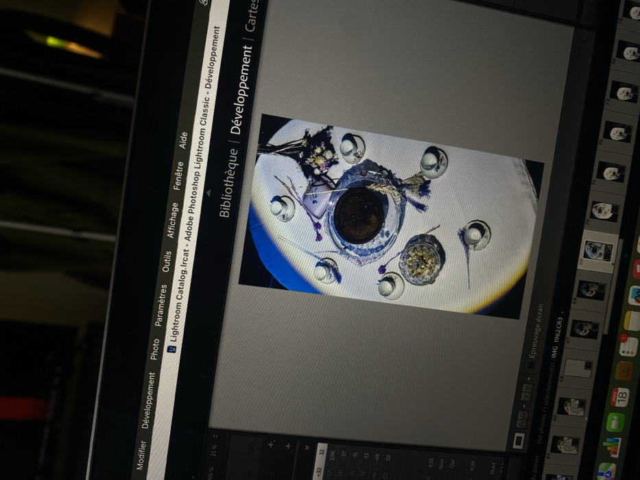 A laptop screen displays Adobe Photoshop Lightroom Classic in the "Développement" (Development) module, within an unspecified indoor location in Lille, France. The screen's main viewer area presents a vertically oriented, overhead photograph of a meticulously arranged tabletop scene. This scene features a central, dark circular object, possibly a cake or pastry, resting on a clear glass plate with a scalloped edge. Symmetrically positioned around the central object are six small, clear glass teacups, each paired with a matching saucer. Two distinct bunches of dried flowers are present: one predominantly purple/lavender and another composed of darker, perhaps white or cream-colored, dried blooms. A clear glass bowl containing granular material, possibly seeds or small decorative elements, is located in the lower-left of the arrangement. A long, thin, clear glass rod or spoon extends into the composition from the top-left. The surface beneath these items is white, illuminated by a prominent, circular blue light source in the upper-left of the displayed image. The Lightroom interface also shows a left-hand panel with editing controls and numerical adjustments (e.g., "+32", "-57"). A filmstrip along the bottom displays image thumbnails, with "IMG_1962.CR3" highlighted as the selected image. The laptop's macOS dock is partially visible at the bottom of the physical screen, showing application icons and a calendar indicating "MAY 18." The ambient environment surrounding the laptop screen is dimly lit and out of focus, revealing indistinct reflections on the screen's surface. No individuals are visible in the scene.
