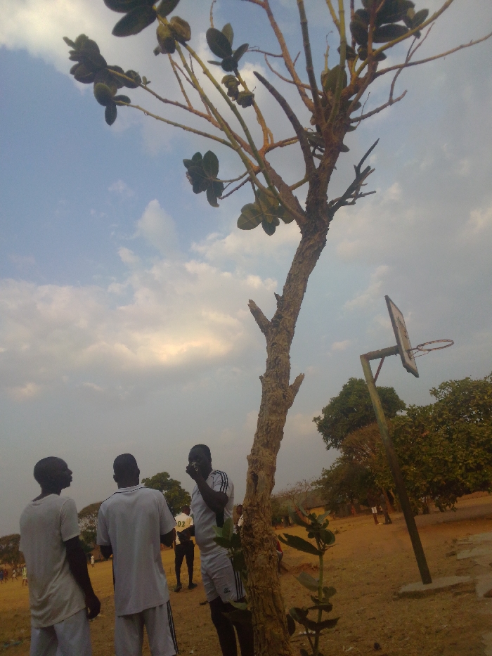 An outdoor scene in Saminaka, Nigeria, depicts a dusty, reddish-brown field under a cloudy sky. In the foreground, three adult males are present. The man on the left wears a white t-shirt and white shorts, standing with his left side visible. The central man wears a white t-shirt with "02" printed on the back and white shorts, facing away from the camera. The man on the right, partially obscured by a tree, wears a white athletic shirt with black shoulder stripes and white shorts; he holds an object to his mouth with his right hand. A tall, slender tree with a rough trunk and sparse green foliage at its crown dominates the center-right foreground. To the right of the tree, in the mid-ground, stands a weathered basketball hoop with a white backboard and a red metal rim on a rusty pole. Additional figures are visible in the background, suggesting a larger gathering or activity on the field. Sparse green trees and bushes are scattered in the mid-ground and background.