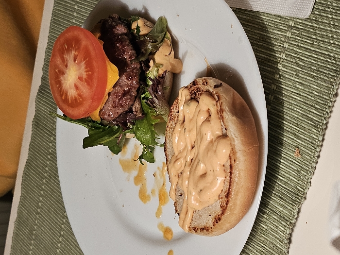 - "The image depicts a partially disassembled burger presented on a white, round plate, situated on a green, horizontally ridged placemat in the city of Veliko Tarnovo, Bulgaria" by FM-LXbvg2, licensed under CC BY 4.0