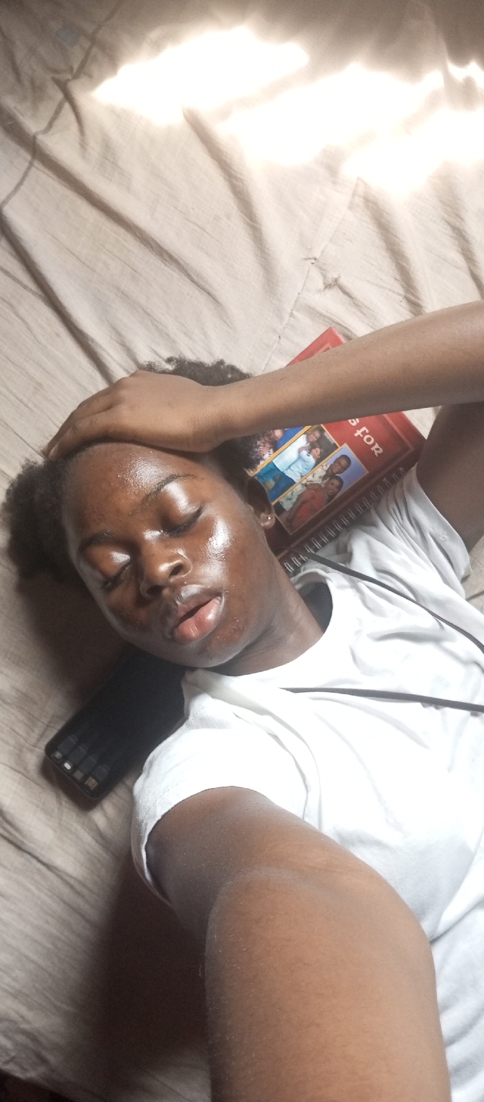 A dark-skinned individual lies on a neutral-colored bed, eyes closed. A cell phone rests near the head, while a book titled "Prayers for" is positioned between the head and arm. The person is wearing a white T-shirt. Light reflects off the skin, creating a glossy appearance. The hand rests on the forehead, adding to the relaxed posture. The scene suggests a moment of rest or contemplation.